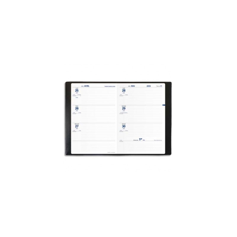 Format 16 x 24 cm. 1 semaine sur 2 pages de septembre à août. Couverture plastique grainée noire. Texthebdo.