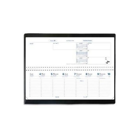 Agenda de bureau. Format 30 x 10 cm à l’italienne. 1 semaine sur 1 page de notes en vis-à vis. Couverture plastique grainée noire. Agendascop