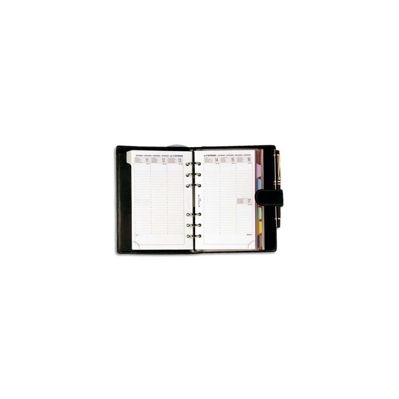 Couverture simili cuir. Semainier millésimé 1 semaine sur 2 pages. Livré complet avec réglet, intercalaires, feuillets adresses / téléphone, bloc quadrillé (sauf format 14), 1 stylo. Exatime Baltique.