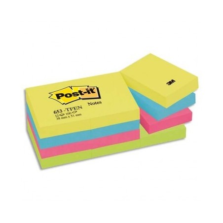 POST-IT Lot de 12 blocs repositionnables coloris énergique dimensions 38x51 mm